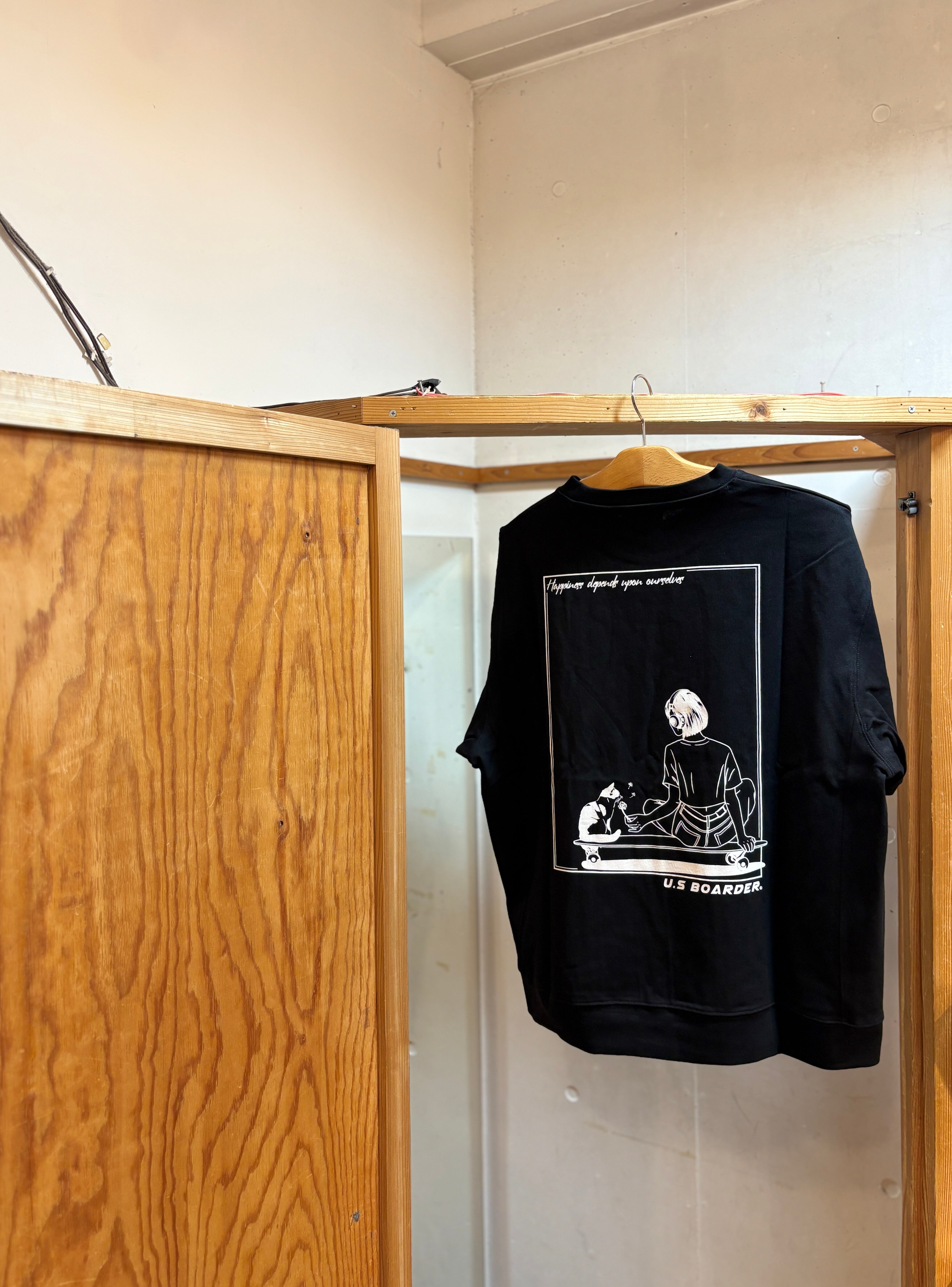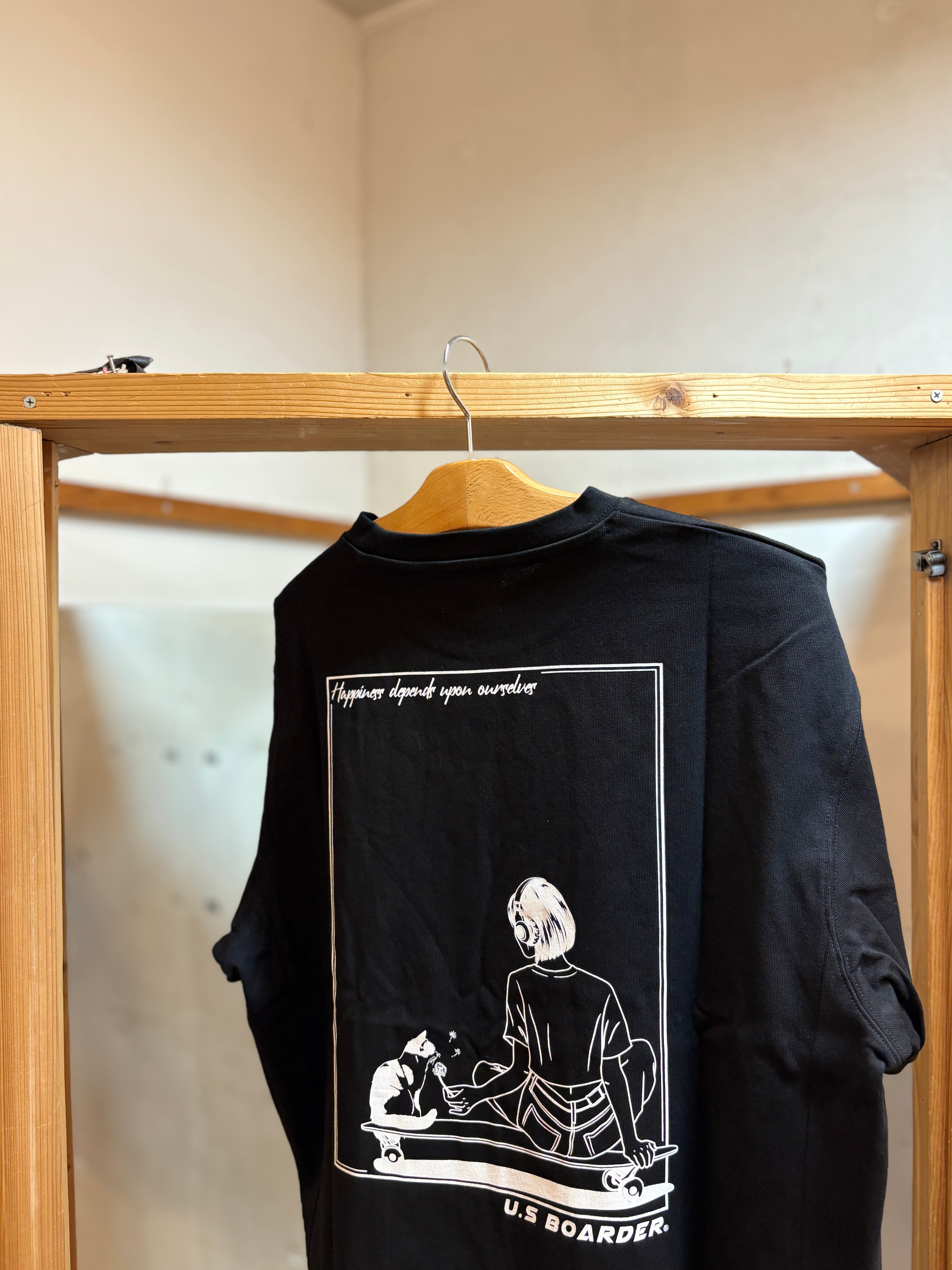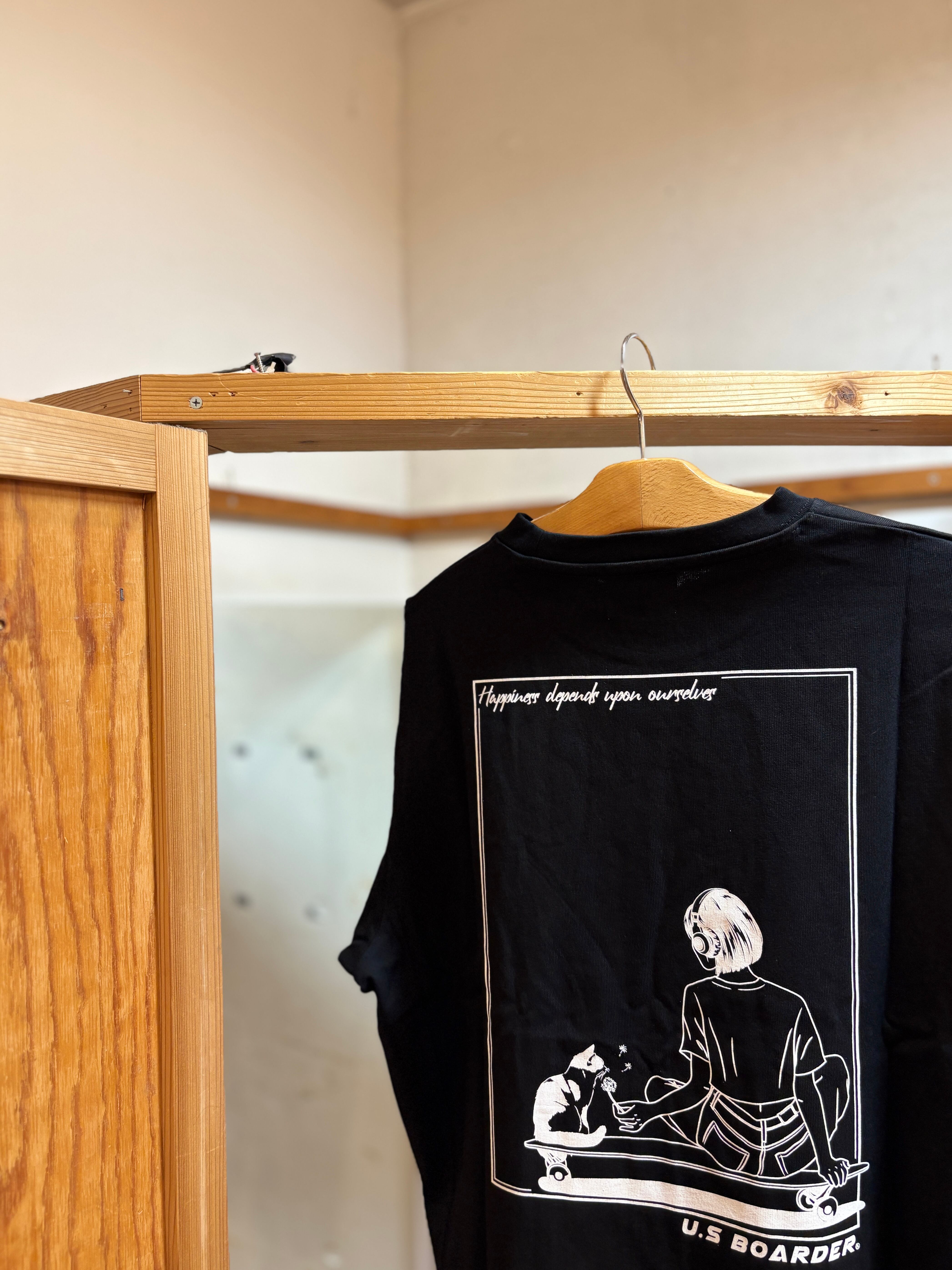 usboarder Sweat style T-shirt S/S スエットT Happiness タンポポと猫とスケートボードと女の子 幸福 幸せ Black ブラック 黒色 アメカジ カジュアル T-shirt ユーエスボーダー