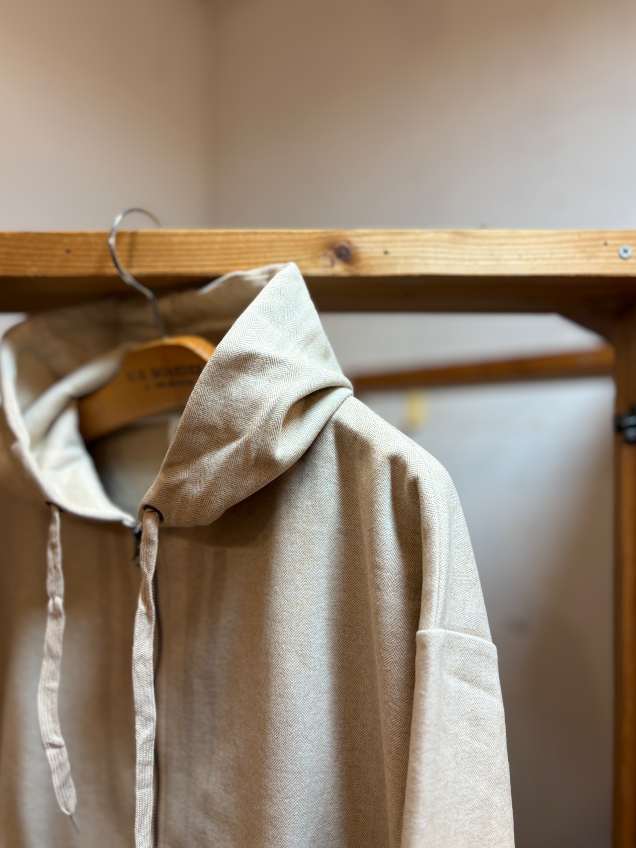 ライトな仕上がりに、フードのボリュームが特徴的です。しっかりと深めに被ることができます。