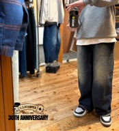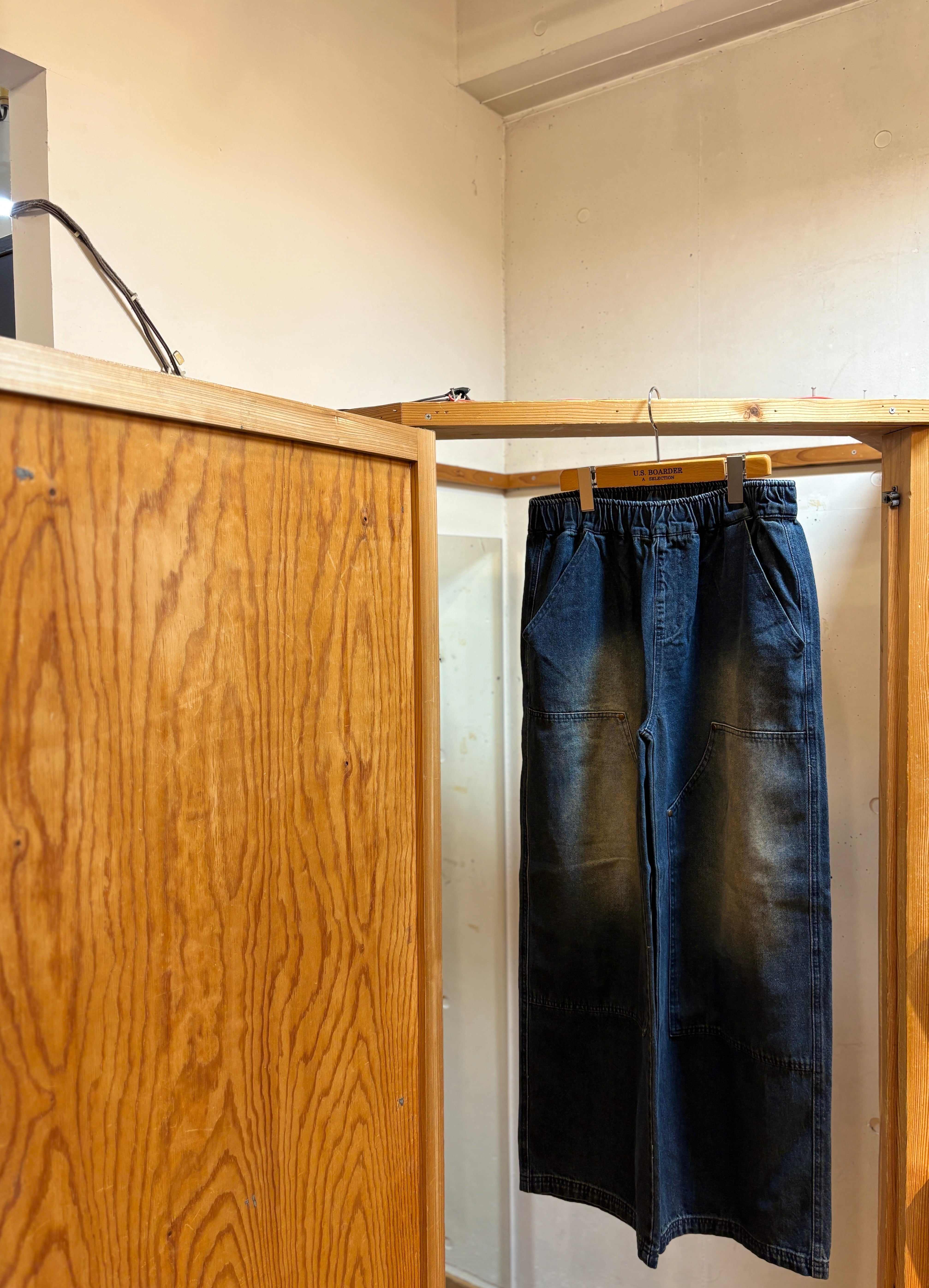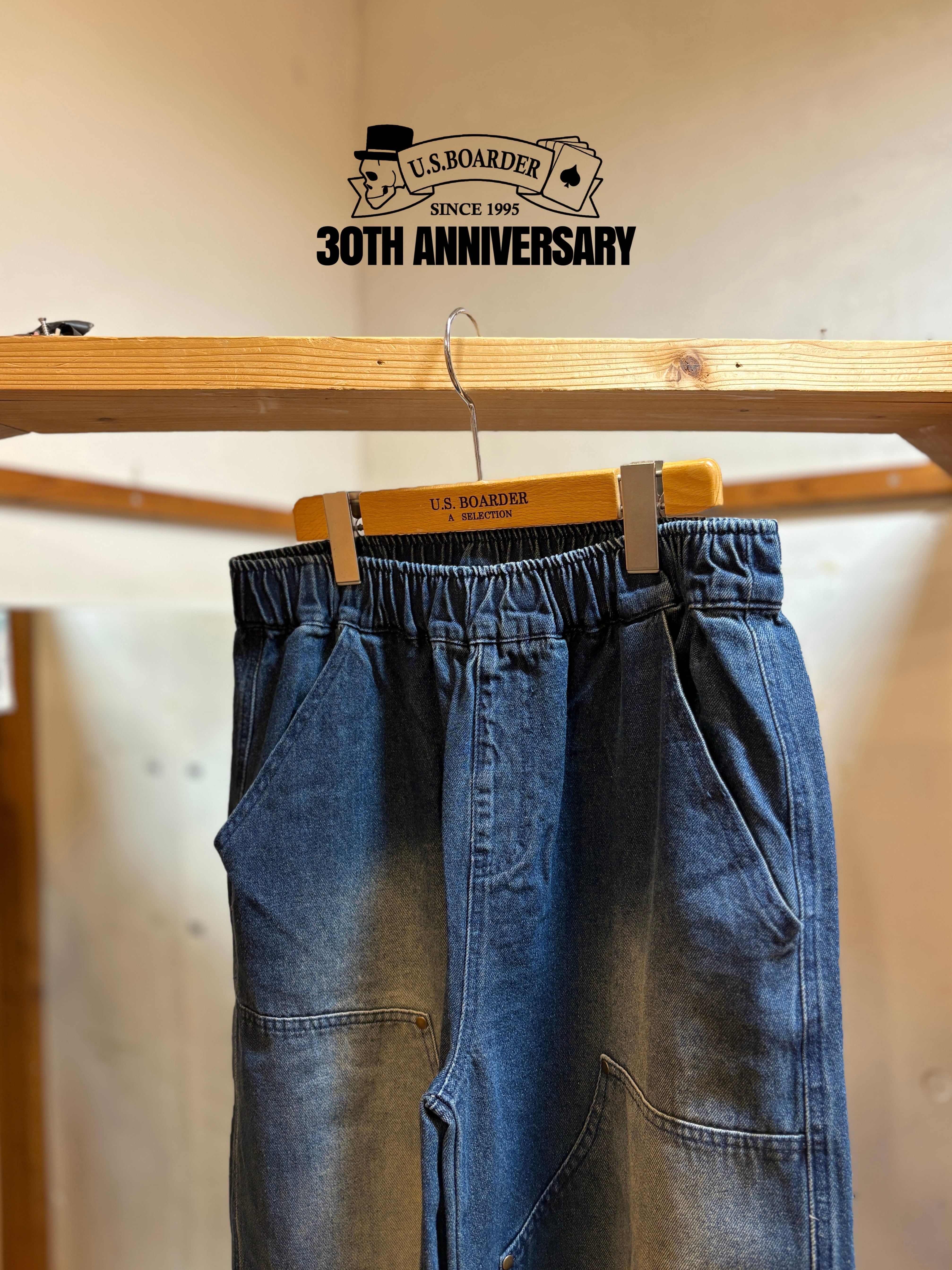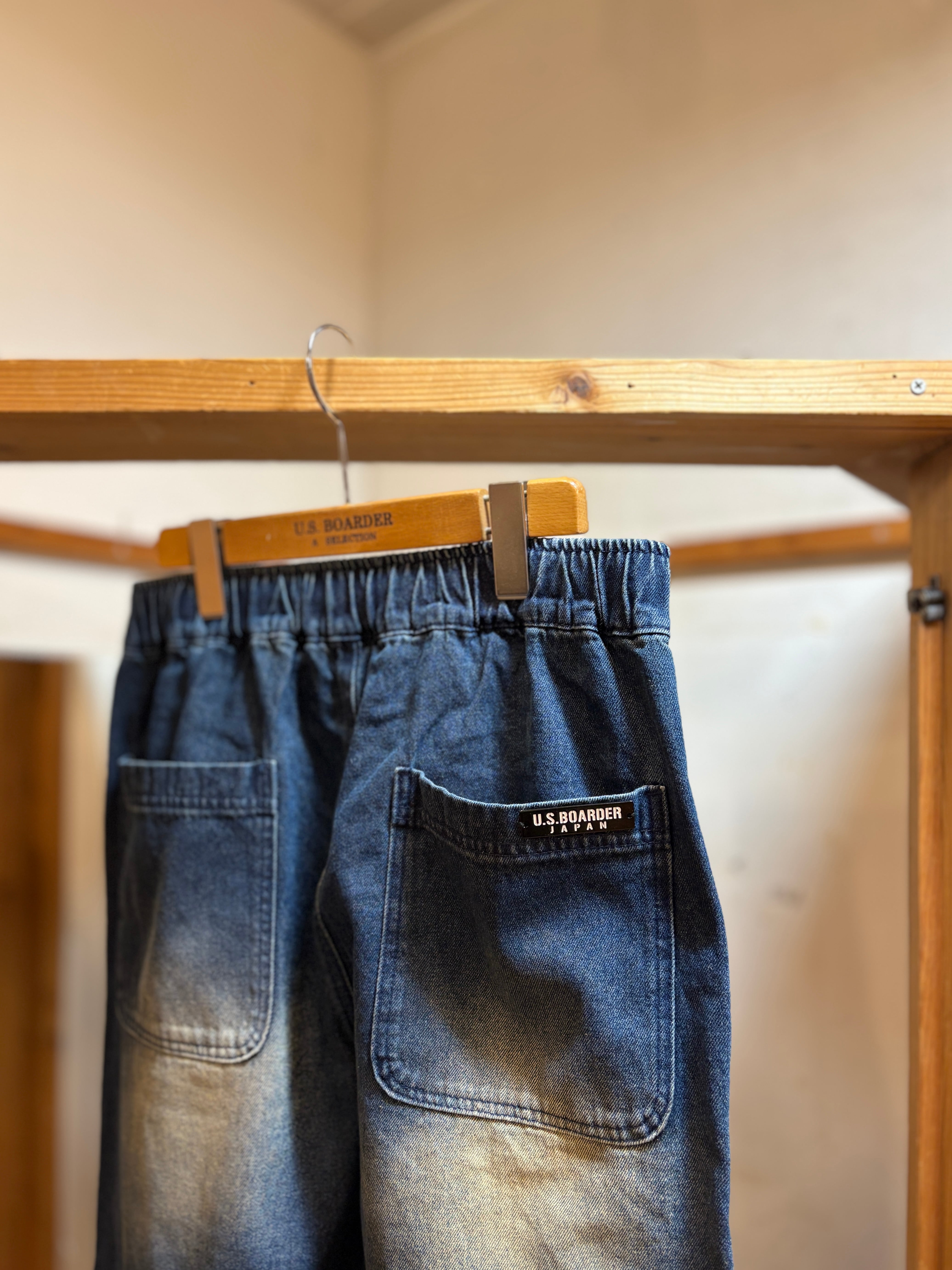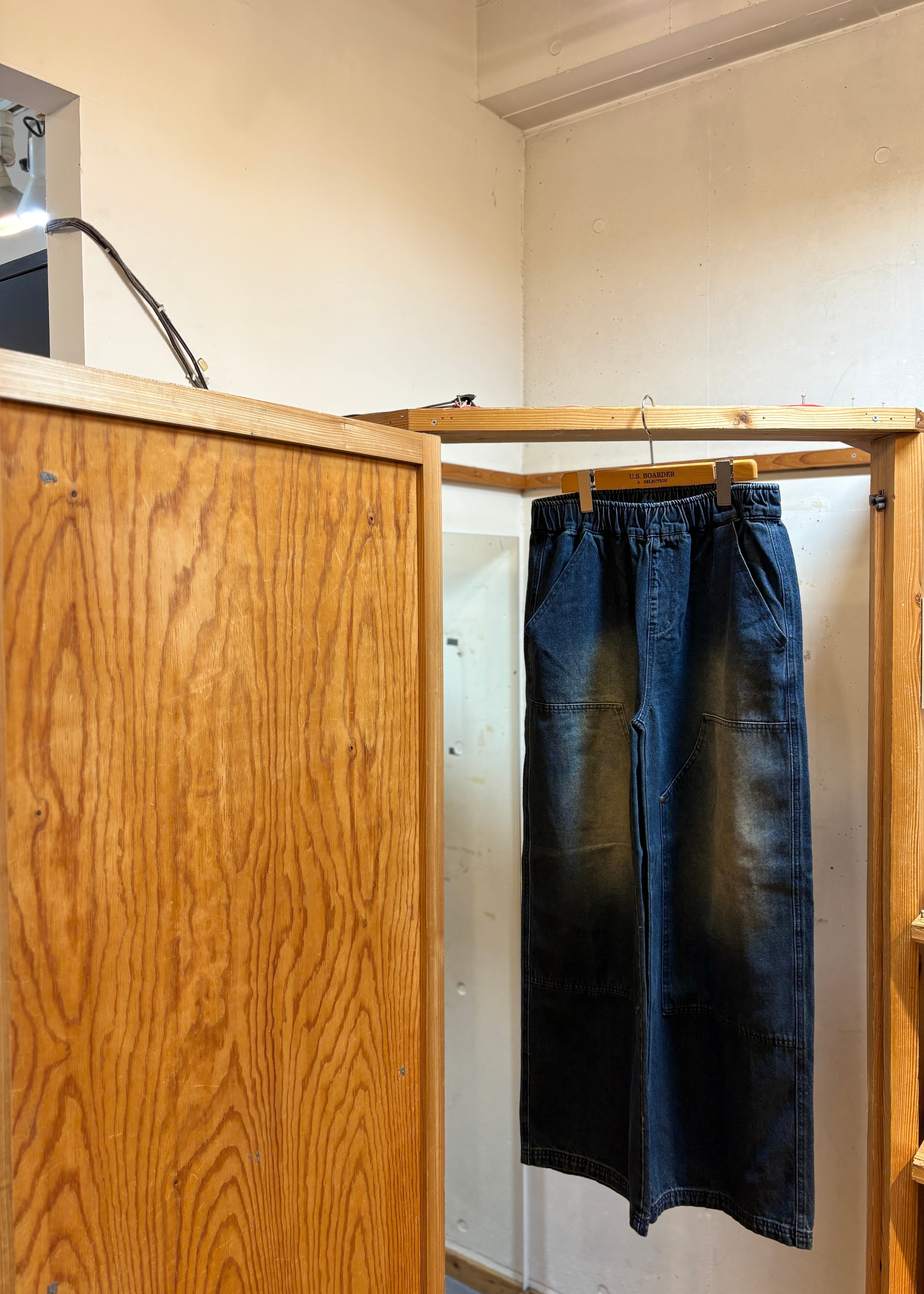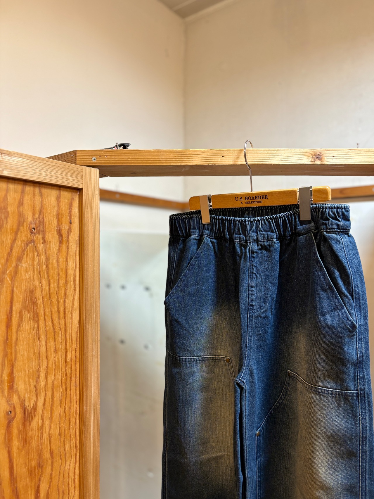 デニムのウォッシュドされた風合い、ダブルニーのパネル切替しが特徴的です。