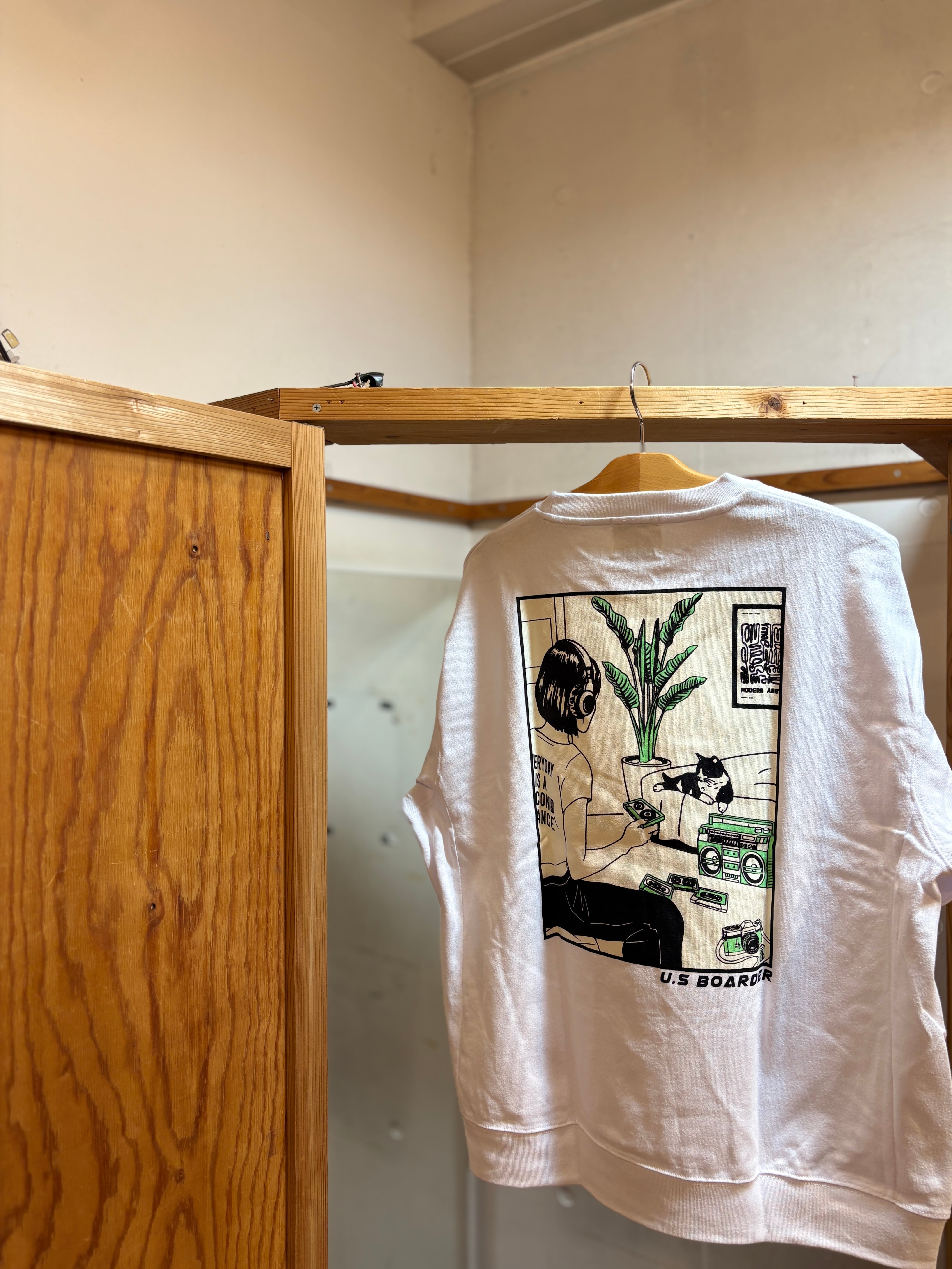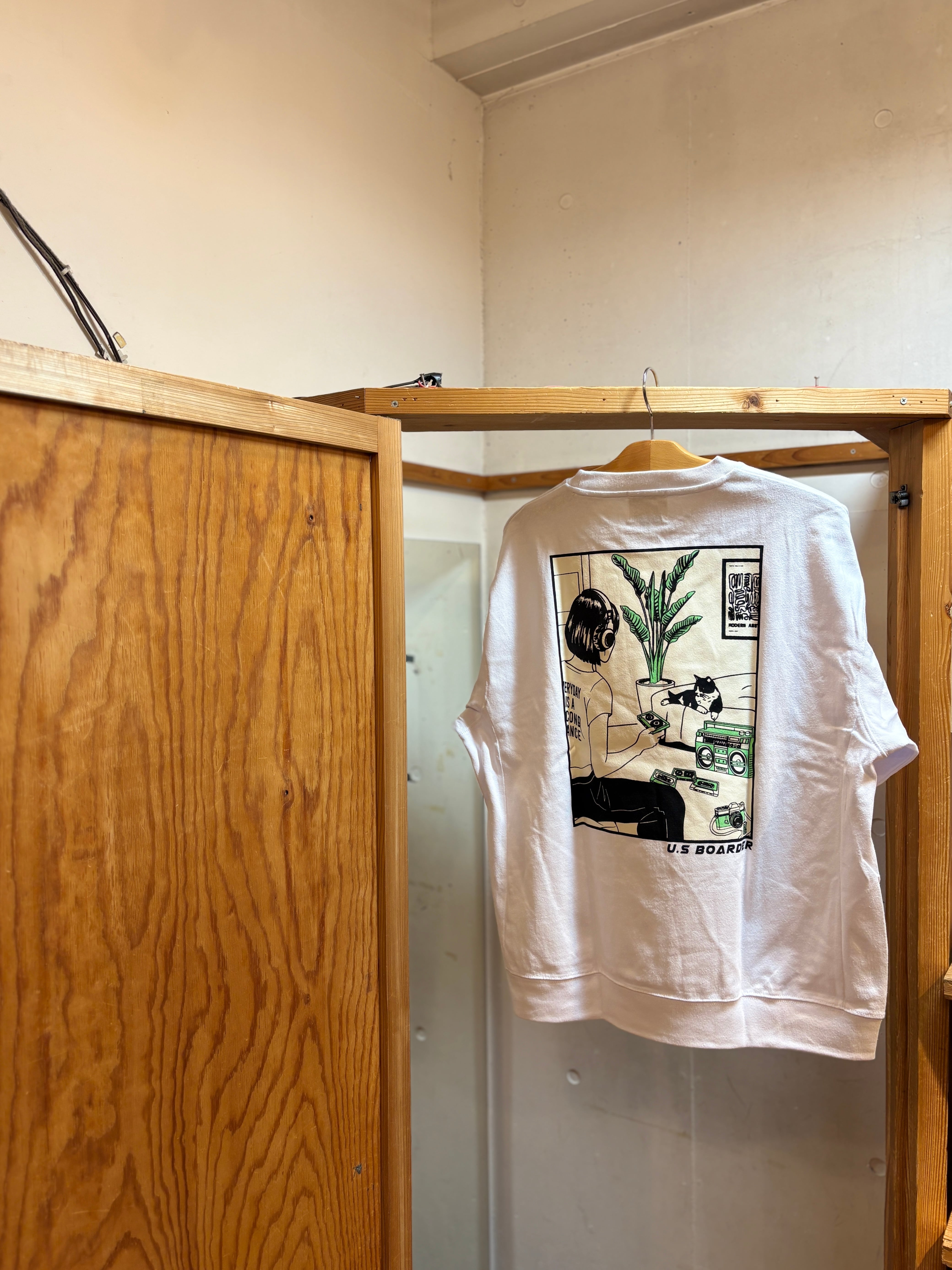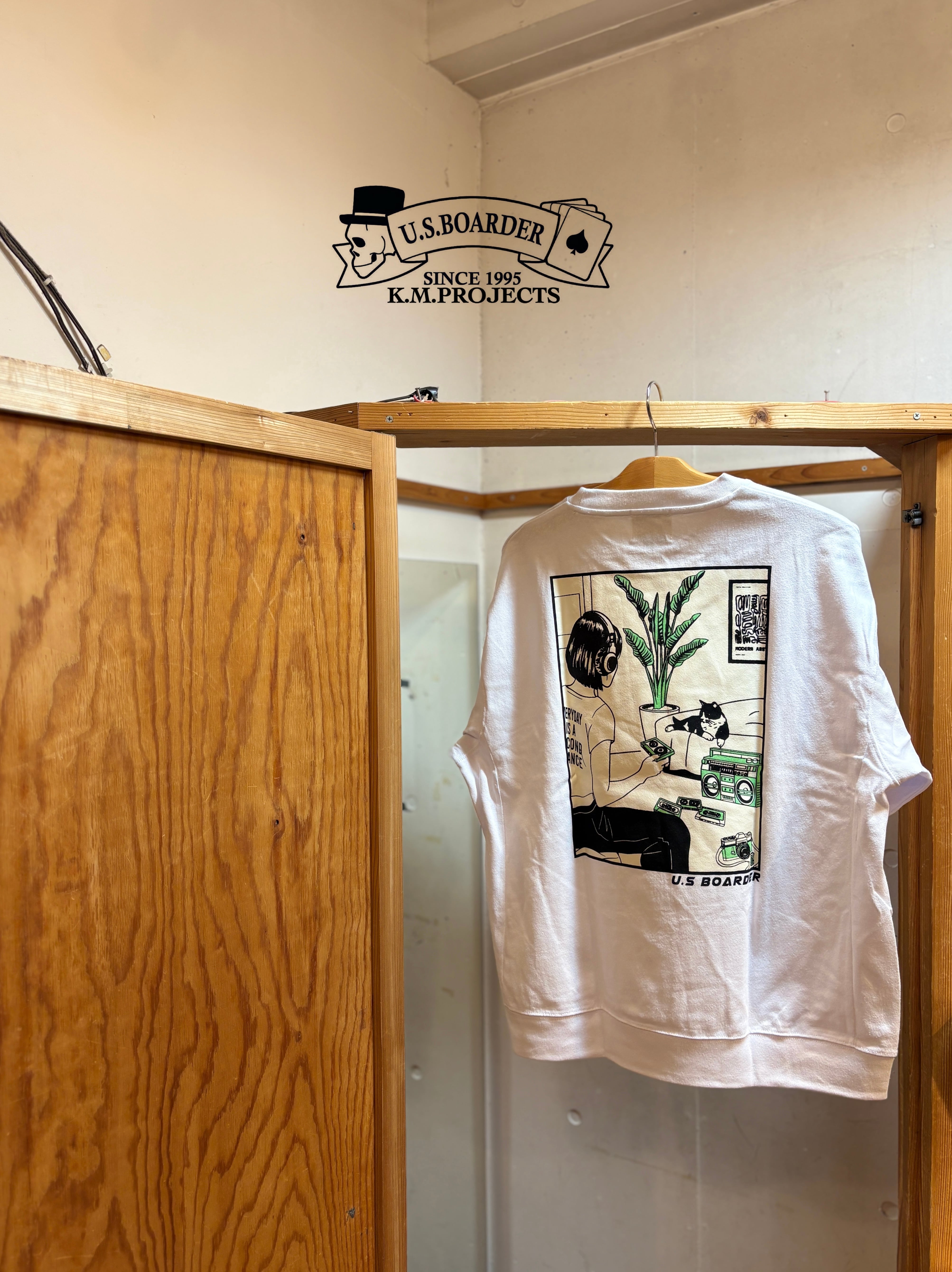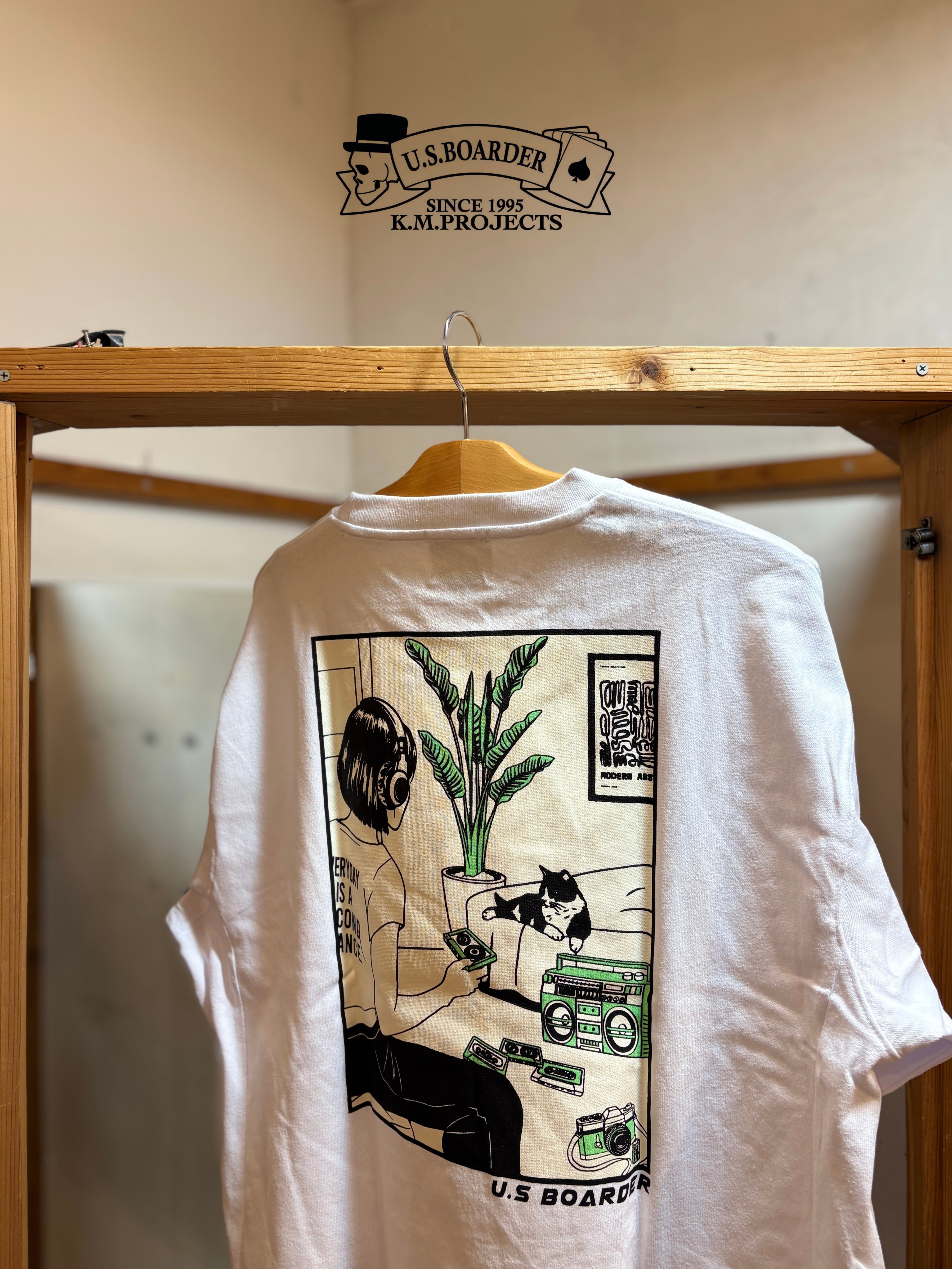 usboarder Sweat style T-shirt S/S スエットT ラジカセ ラジカセとハチワレ猫とスケーター女子 カセットテープ Mix tape White ホワイト 白色 アメカジ カジュアル T-shirt ユーエスボーダー