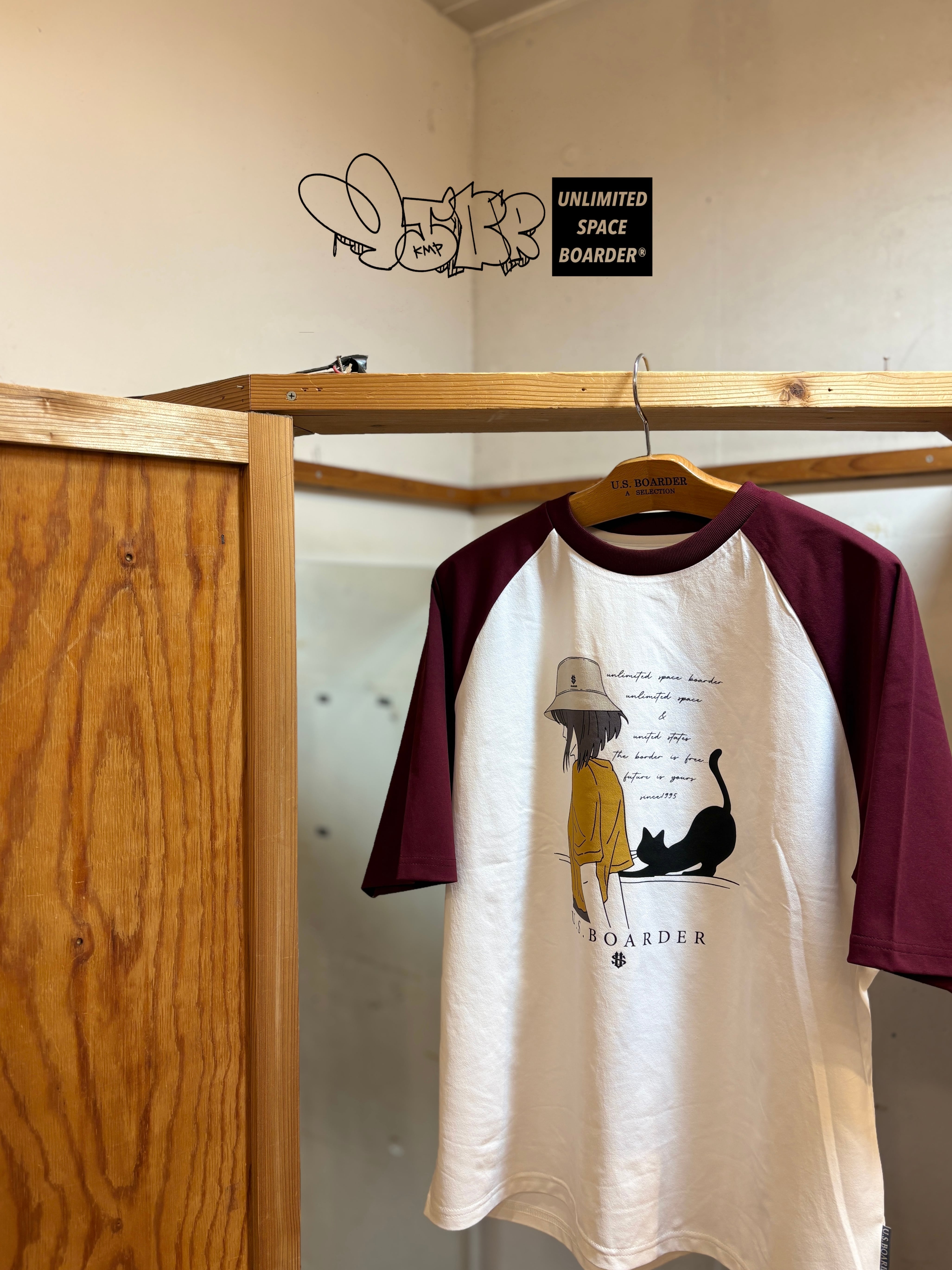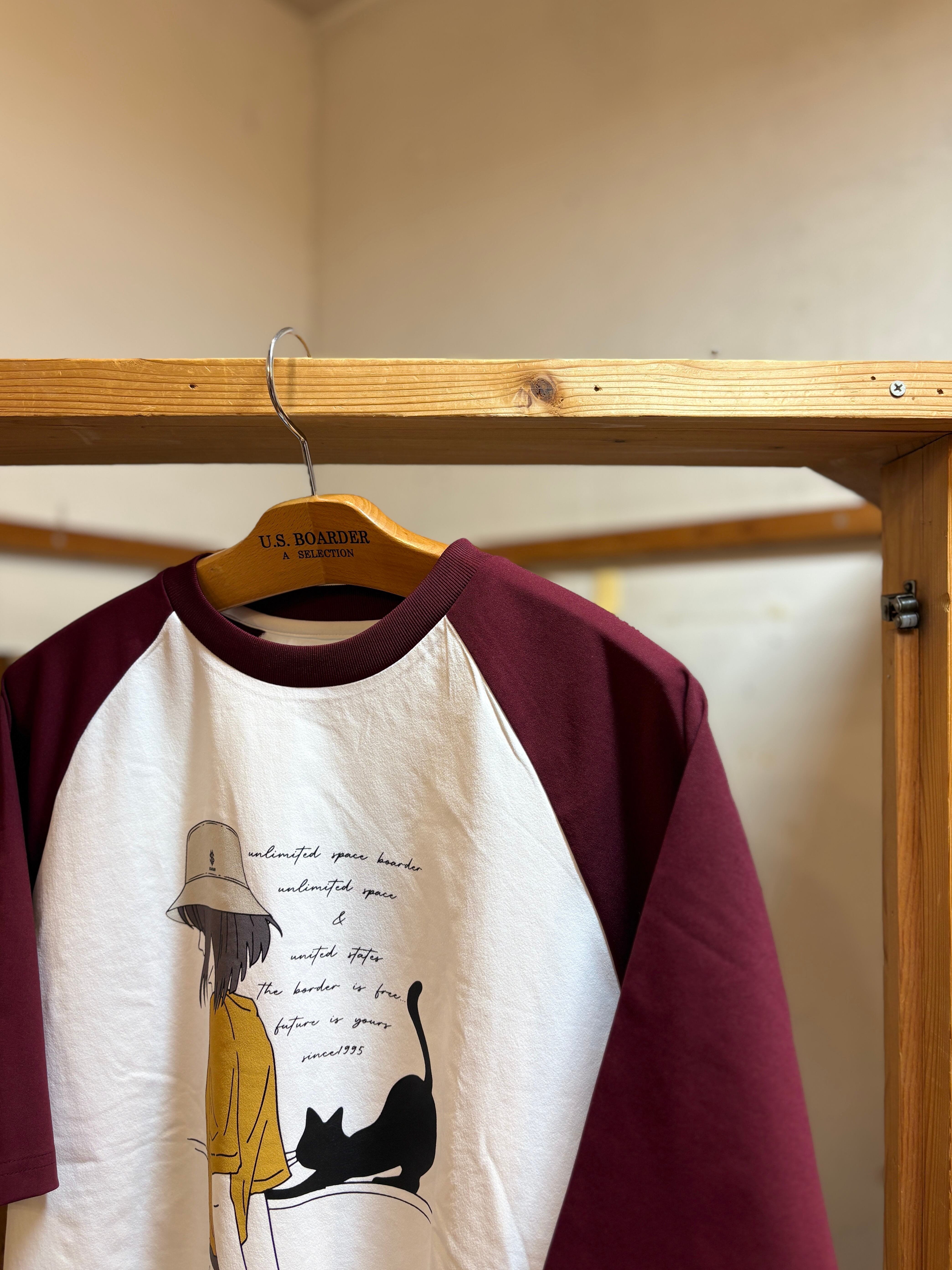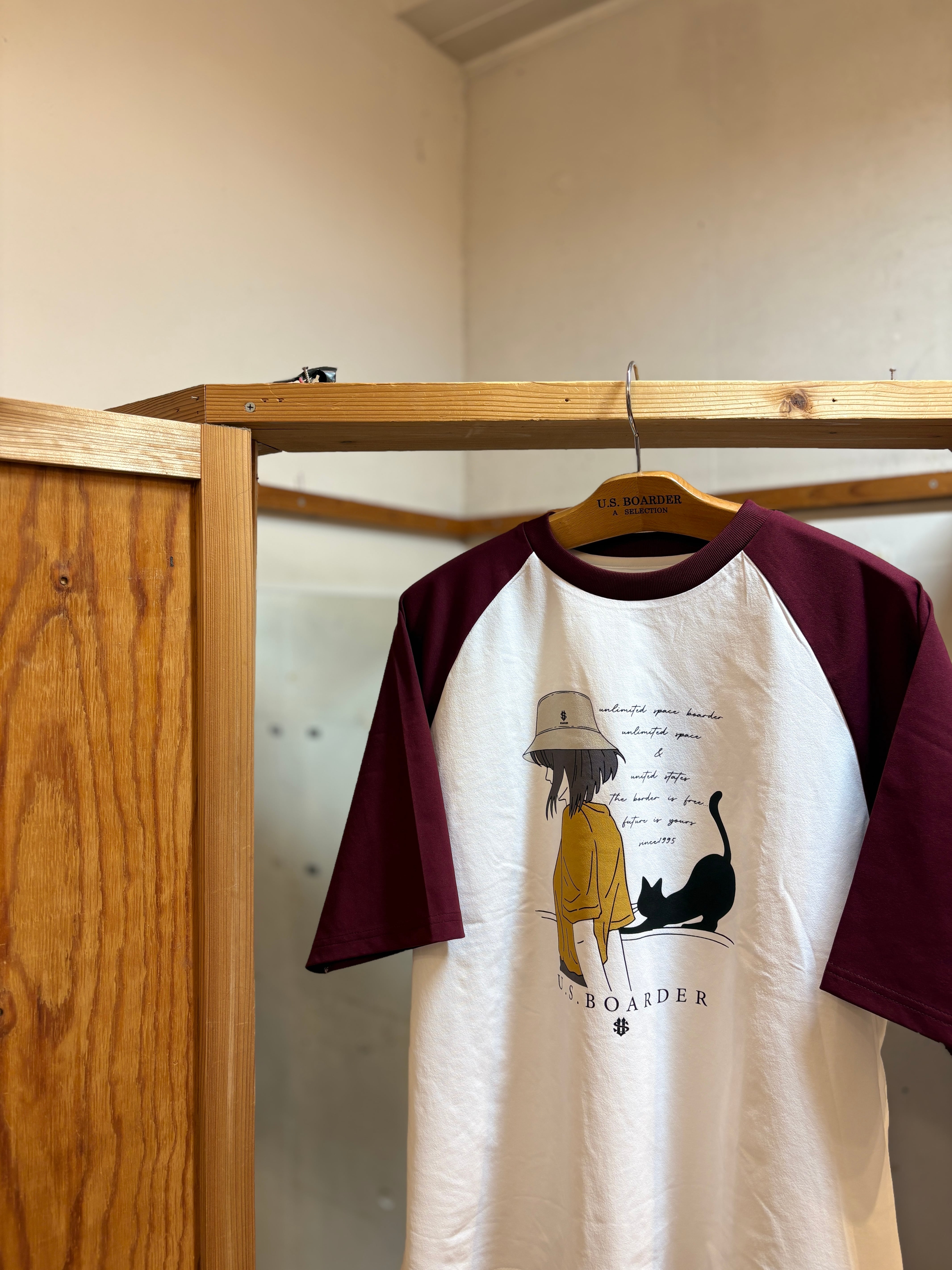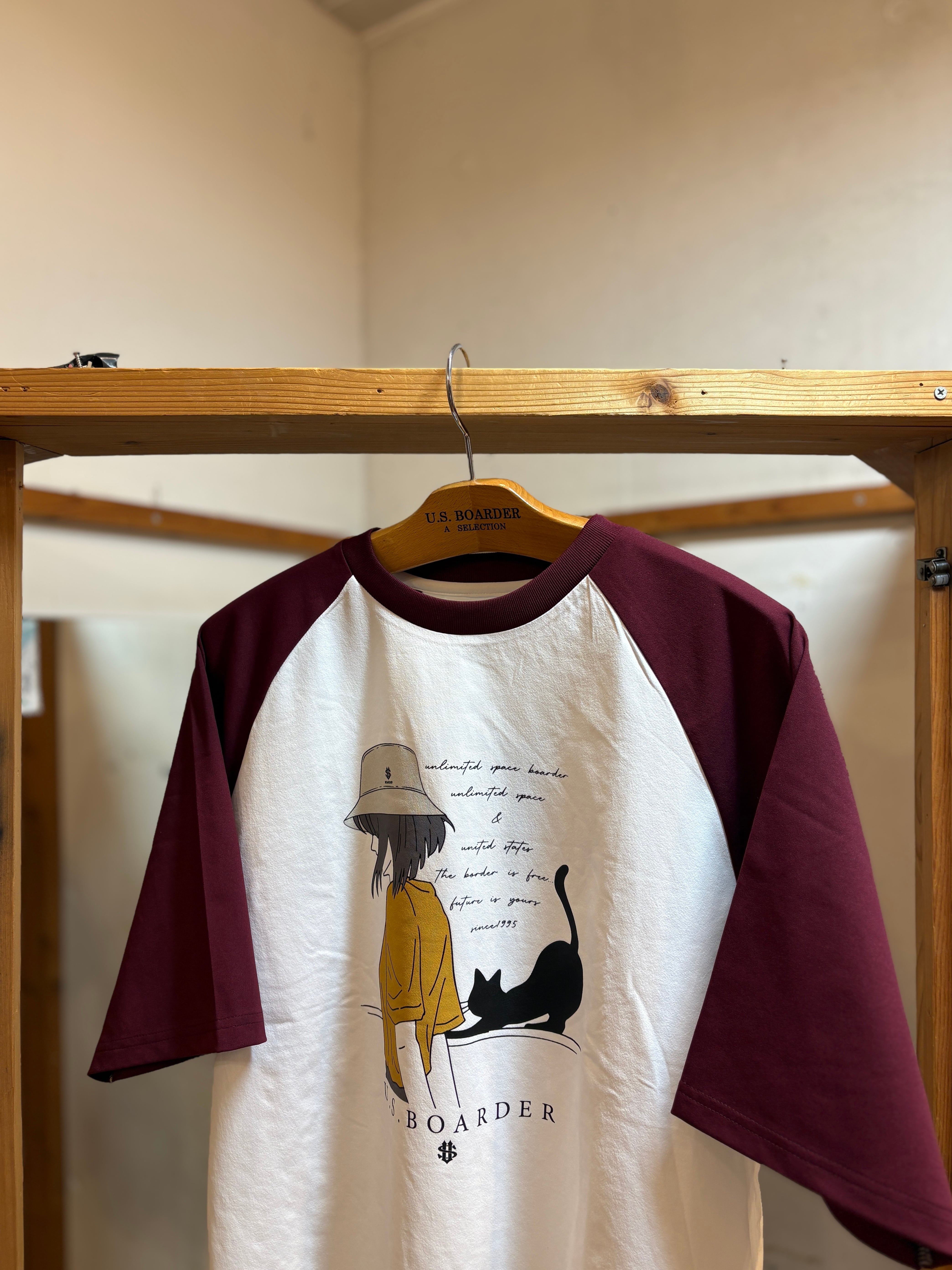 U.S.BOARDER Raglan T-shirt S/S ラグラン T バケットハット女子と黒猫 WNE/WHT Wine / White ワイン ホワイト えんじ色/白色 ストリート女子 Cat 黒猫 ユーエスボーダー usboarder