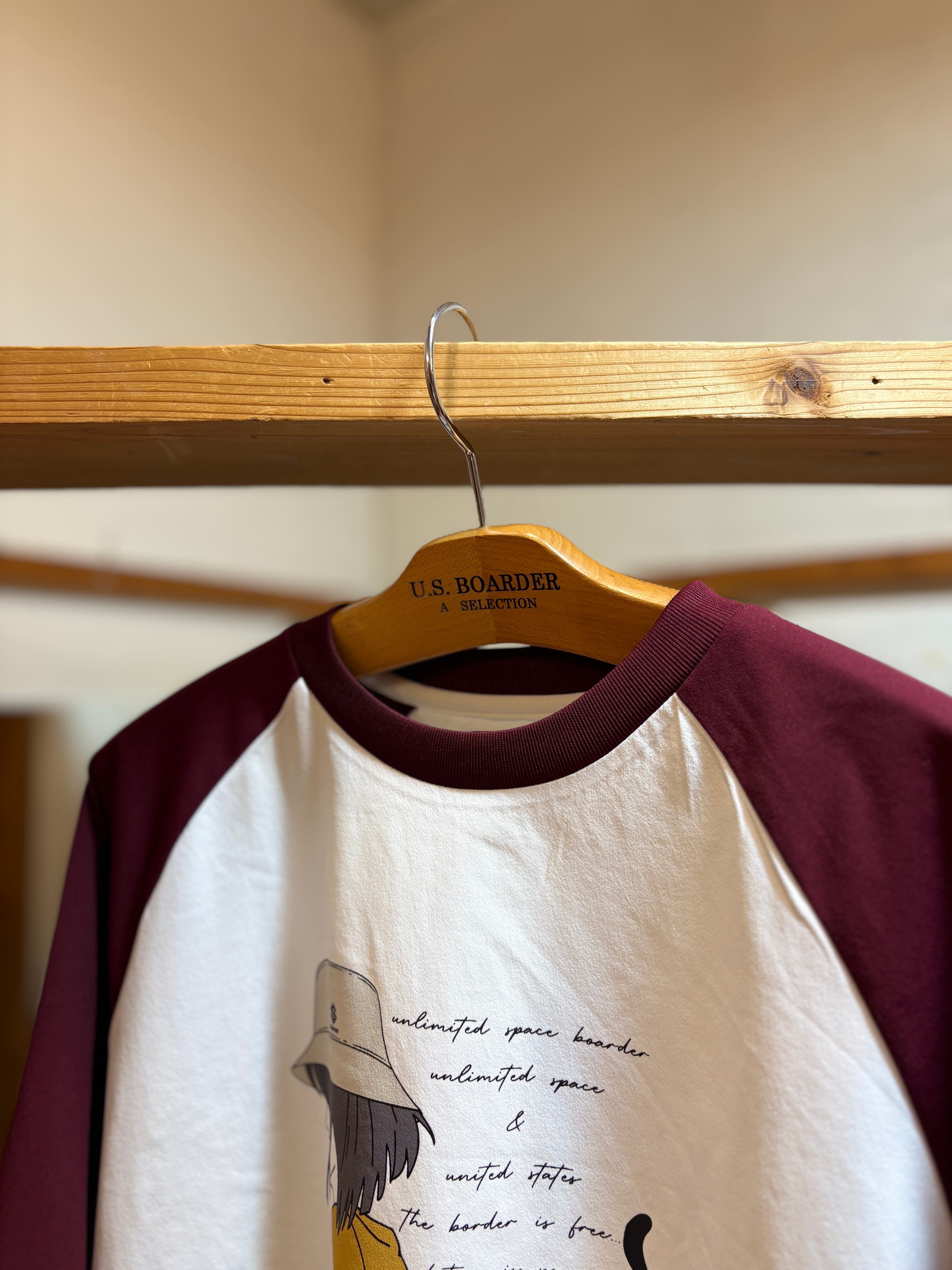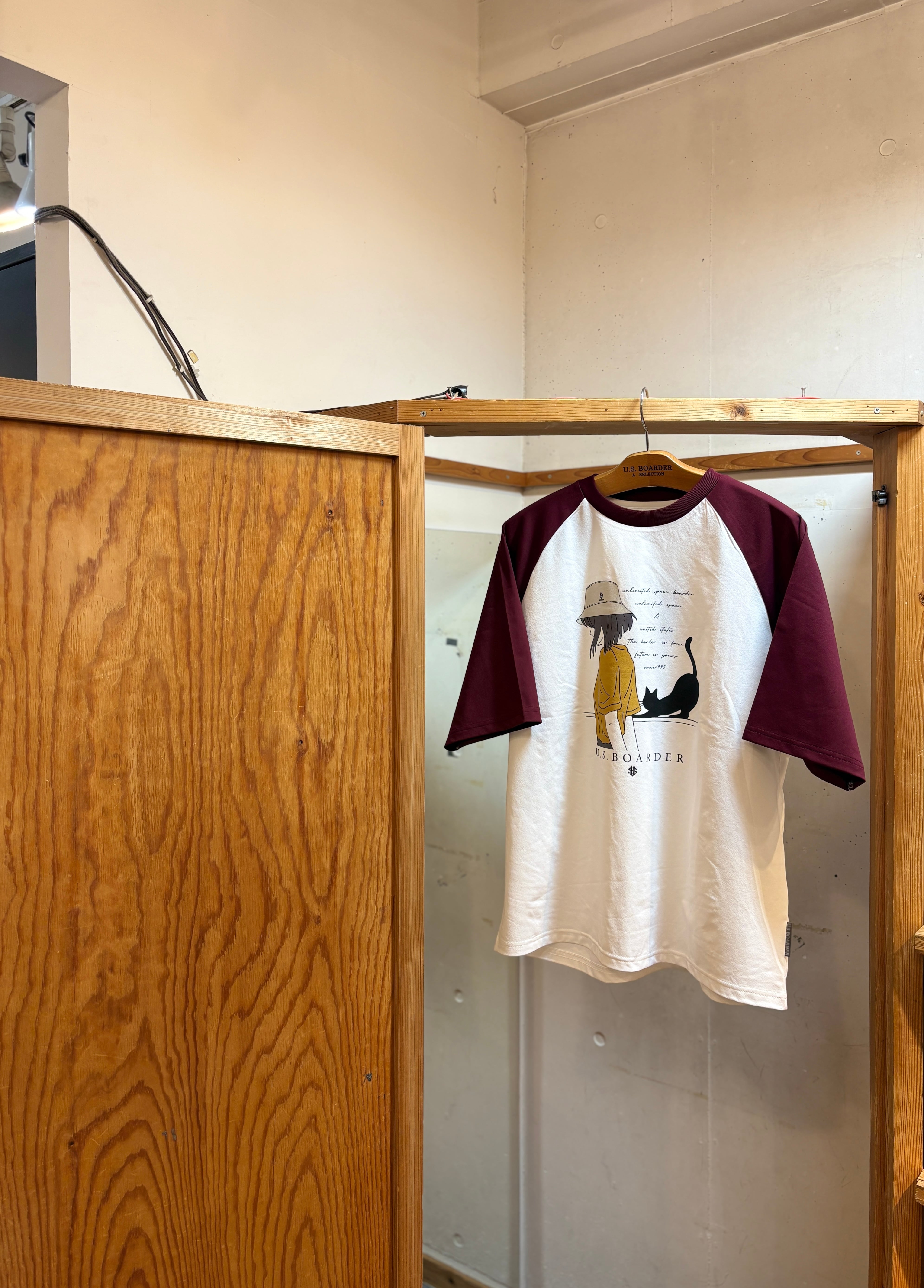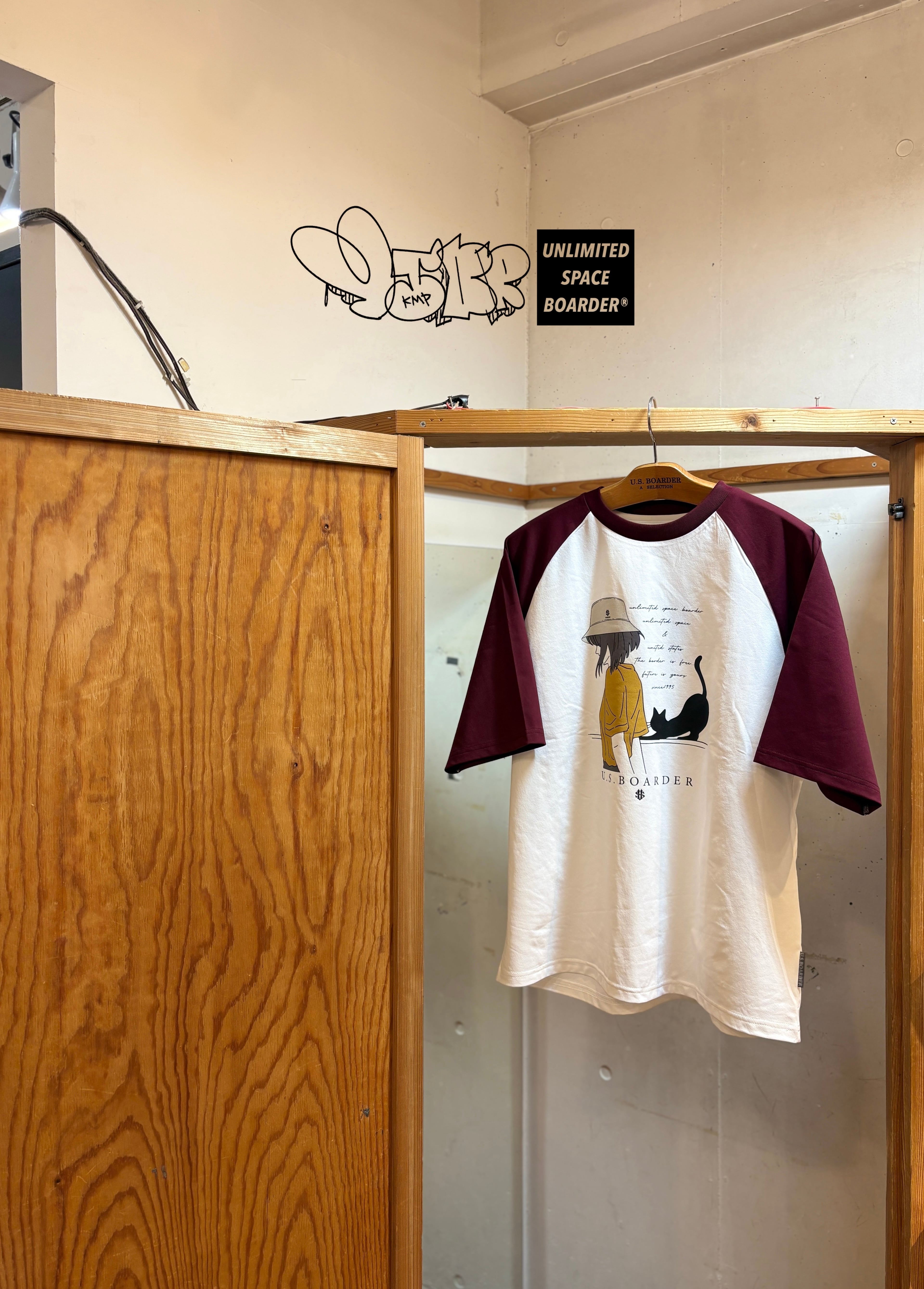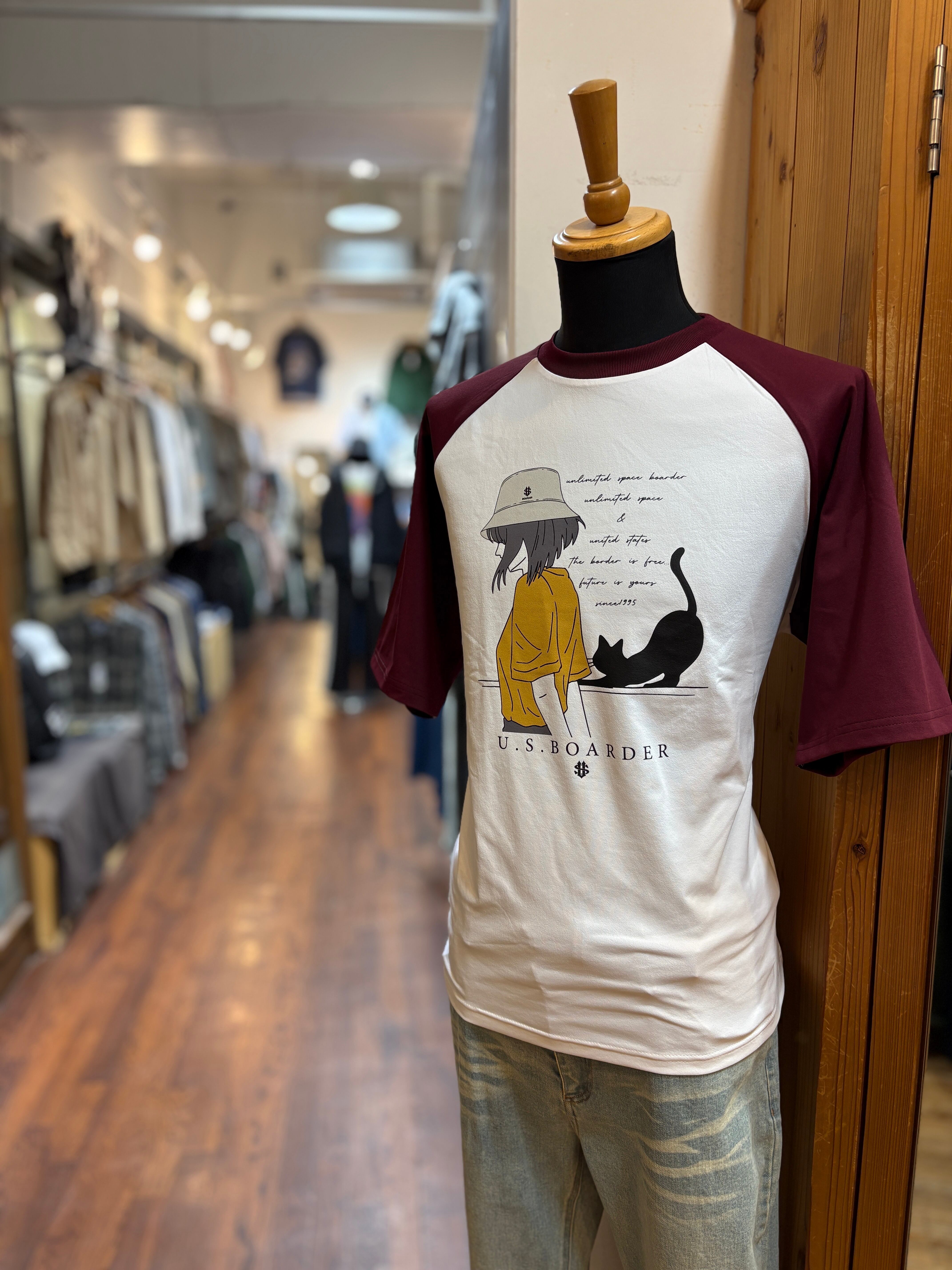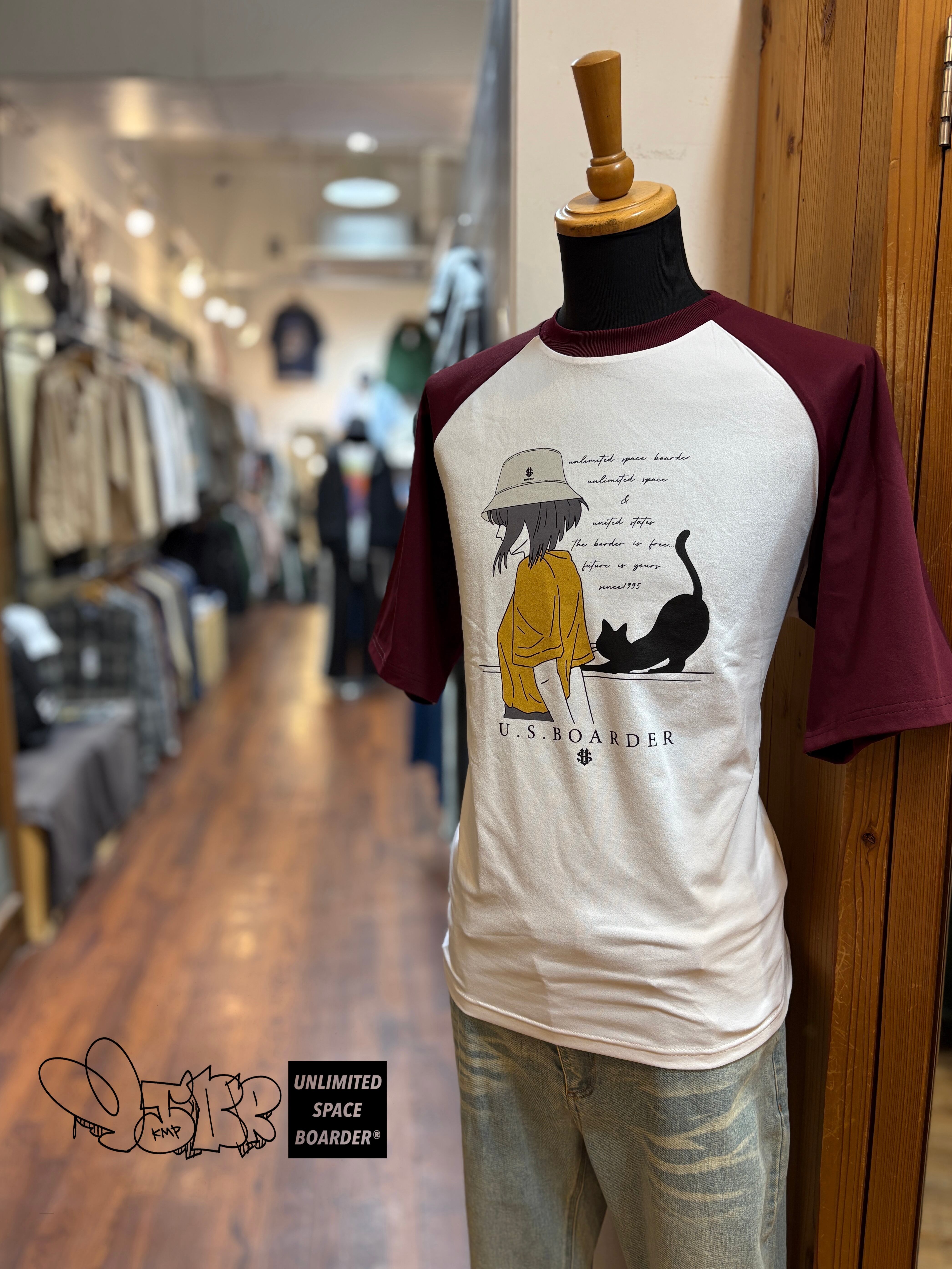 U.S.BOARDER Raglan T-shirt S/S ラグラン T バケットハット女子と黒猫 WNE/WHT Wine / White ワイン ホワイト えんじ色/白色 ストリート女子 Cat 黒猫 ユーエスボーダー usboarder