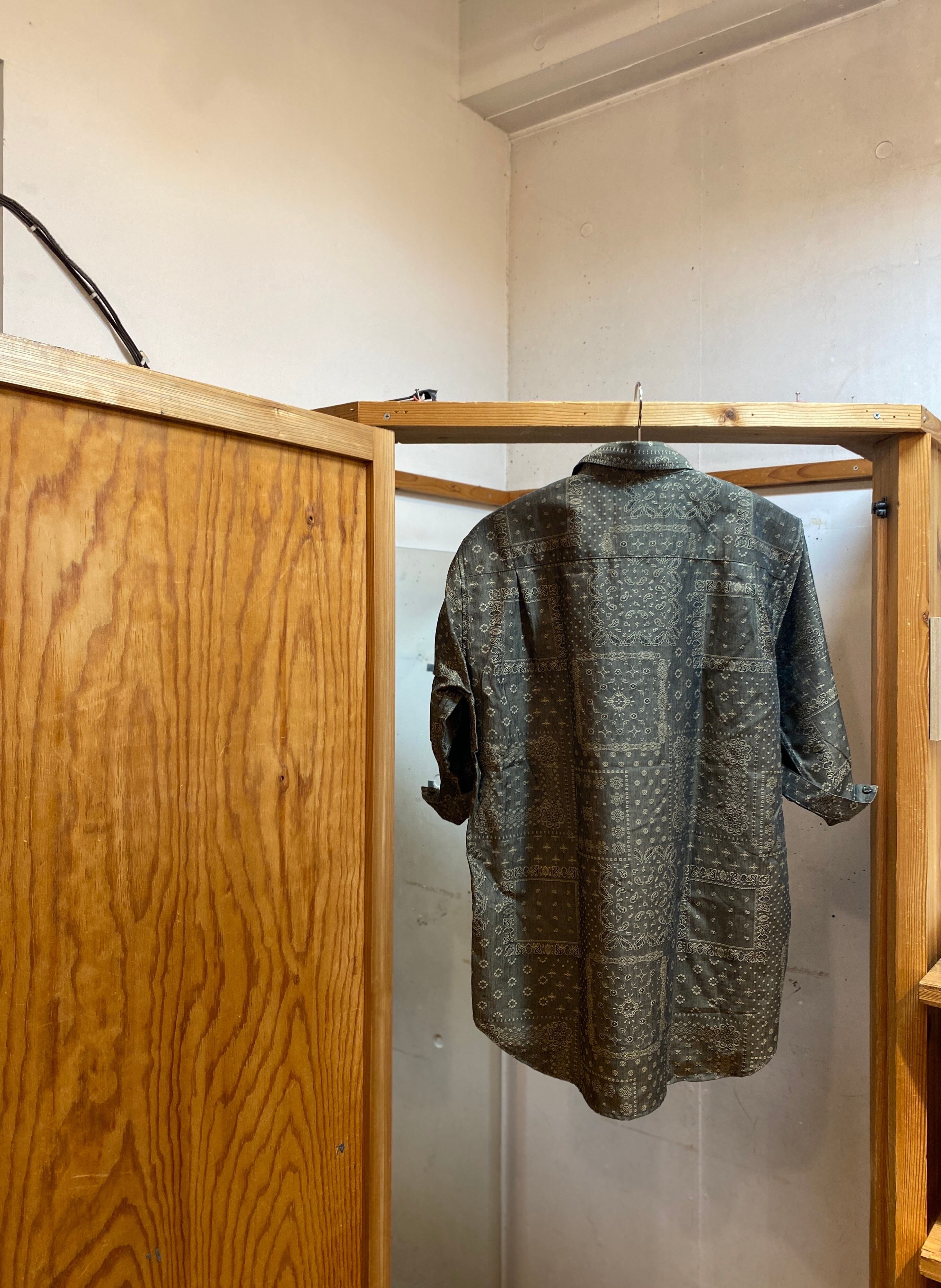 今季は高級感のあるバンダナ柄の織物仕様の生地が特徴的に、総柄模様にゆるりとしたサイズ感、凹凸のある風合いが◎、これからの羽織りアイテムとして重宝します。