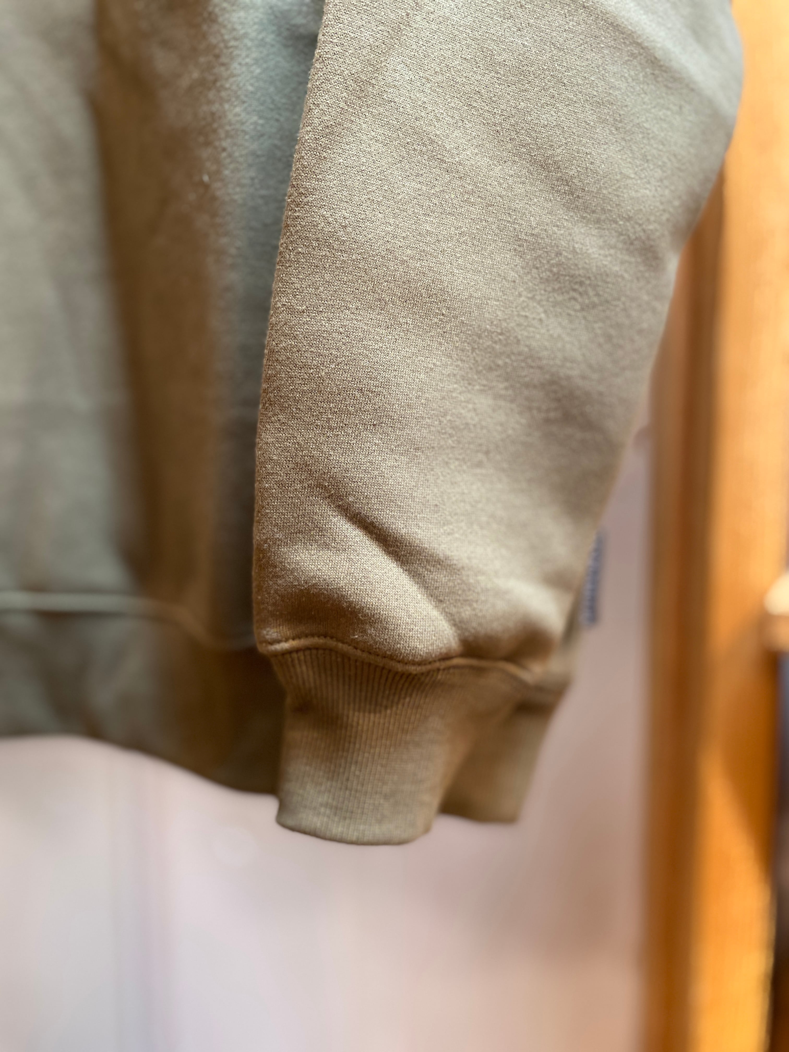 起毛素材で暖かく、生地感は肉厚で軽やかな着心地が特徴的です。
